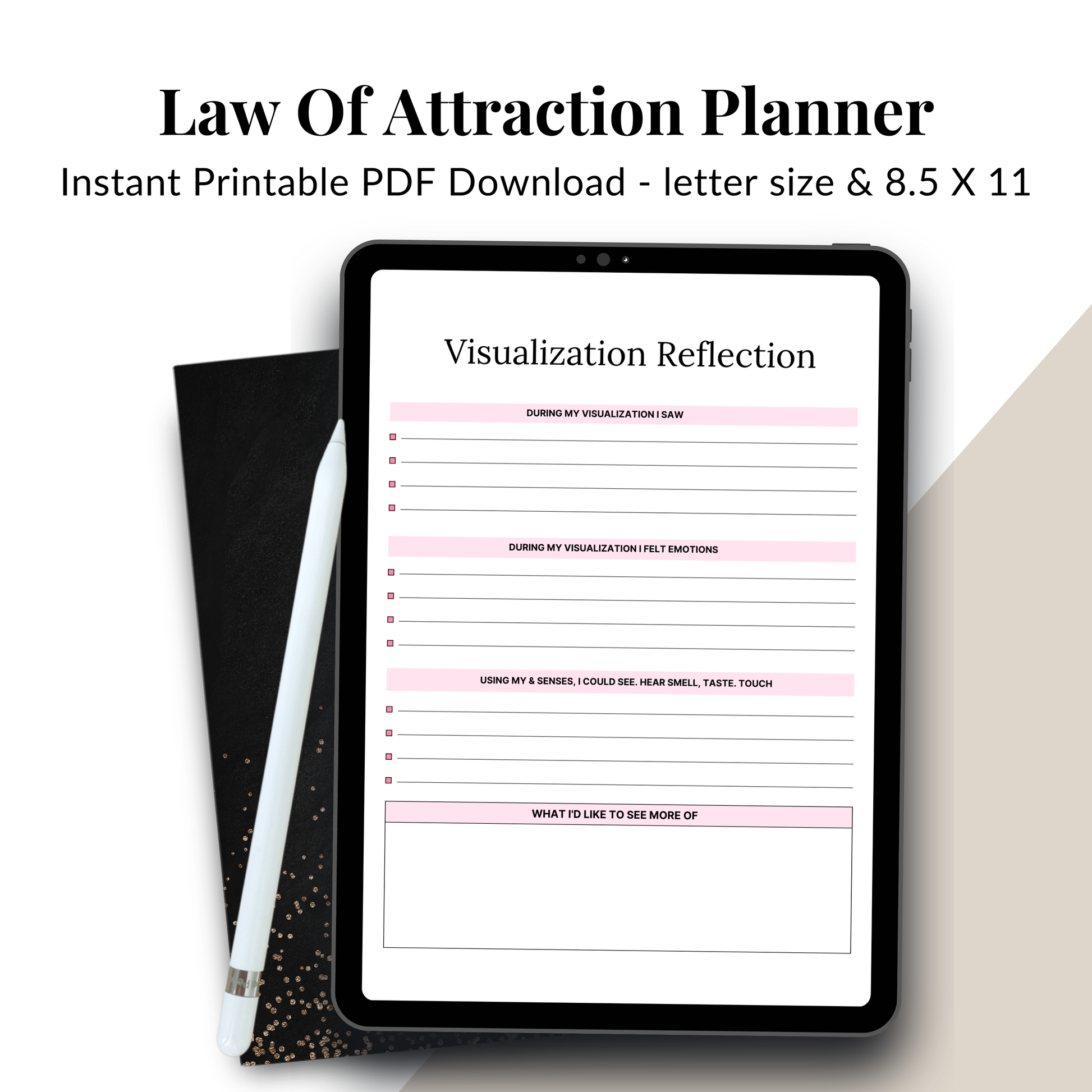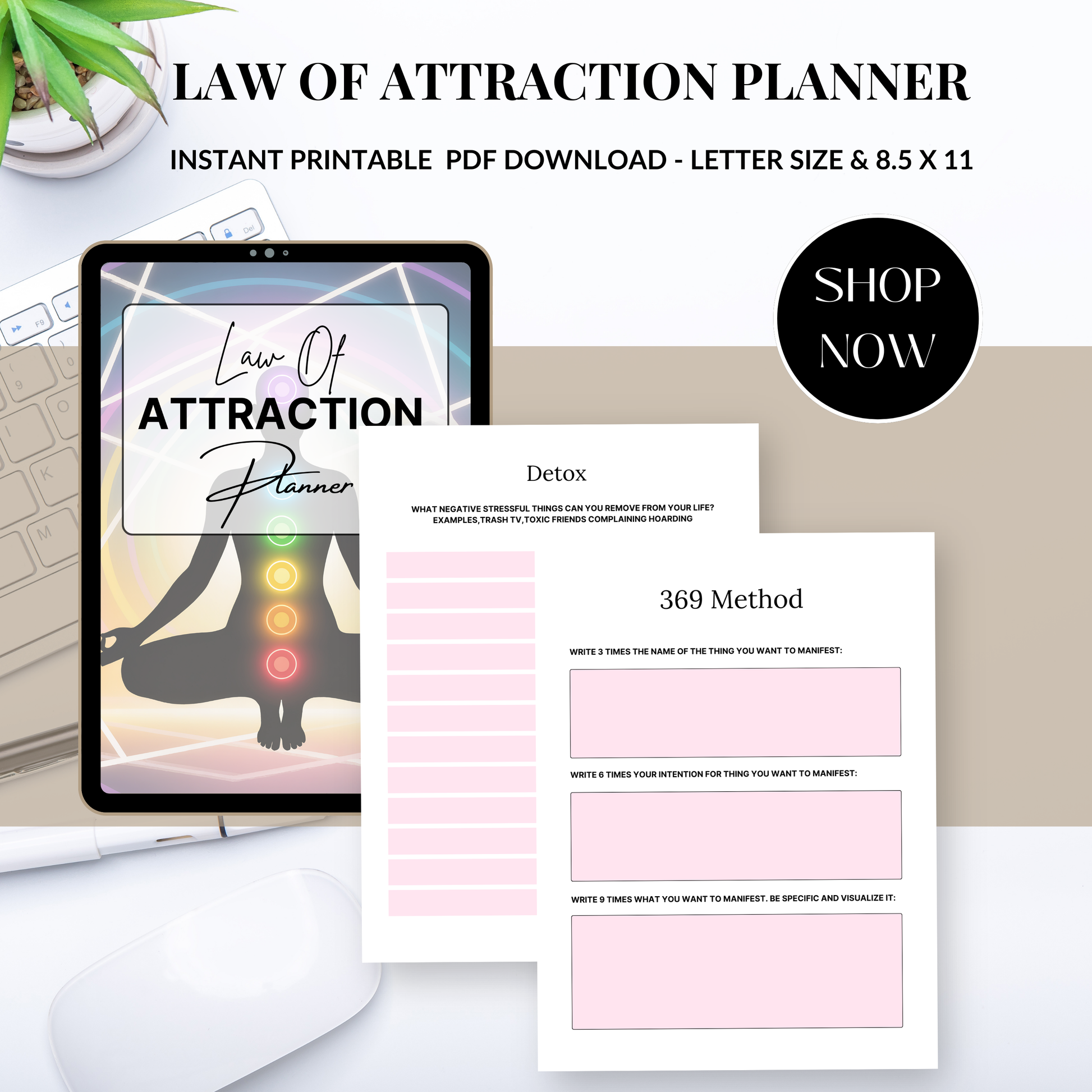 Transform your thoughts into reality with this Law of Attraction Planner, a powerful guided digital planner designed to help you manifest goals, abundance, confidence, and inner peace through daily intention, gratitude, and focused action.